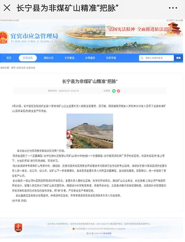 3月25日,宜賓市長寧縣應(yīng)急局組織全縣11家非煤礦山企業(yè)負(fù)責(zé)人和安全管理員、雙河鎮(zhèn)以及硐底鎮(zhèn)政府相關(guān)人員共計(jì)30余人召開了全縣非煤礦山(露天采石場)安全生產(chǎn)現(xiàn)場會。 長寧縣應(yīng)急局邀請兗州中材長寧分公司作為全縣非煤礦山的正面典型為參會企業(yè)分享開采經(jīng)驗(yàn)。 上午9點(diǎn)參會人員到達(dá)長寧分公司―紅獅水泥礦山現(xiàn)場,分公司員工與業(yè)主接待了到場的市縣領(lǐng)導(dǎo)以及企業(yè)參會人員。同時嚴(yán)格按照防疫要求進(jìn)行體溫測量,人員信息登記入場。   9:30分全部人員到齊,由長寧分公司職工帶領(lǐng)大家參觀礦山現(xiàn)場,為參觀人員介紹礦山整體情況,相關(guān)開采技術(shù),并解答參觀人員提出的問題。    10:30參觀結(jié)束,參觀人員對于此行都感到滿意,我們的礦山工作也得到了大家的認(rèn)可,相關(guān)同仁們都紛紛表達(dá)此行收獲甚多。 現(xiàn)場參觀學(xué)習(xí)結(jié)束后,當(dāng)天下午召開了室內(nèi)培訓(xùn)會,培訓(xùn)會邀請了市專家?guī)鞂<遥瑫r長寧分公司職工葉剛同志很榮幸在受邀之列。 針對于非煤礦山安全開采等技術(shù)問題,兗州中材長寧分公司作為正面企業(yè)給參會企業(yè)分享了好的經(jīng)驗(yàn),同時也從會議中汲取了其他好的經(jīng)驗(yàn)方法。 3月27日,宜賓市應(yīng)急管理局報道了此次會議。此次會議中市縣領(lǐng)導(dǎo)高度評價了兗州中材長寧分公司的礦山開采工作,同時被市縣領(lǐng)導(dǎo)評為正面典型我司感到很榮幸。在此后的工作中我們要更努力,爭取更大的進(jìn)步,樹立好我們的企業(yè)形象。 |