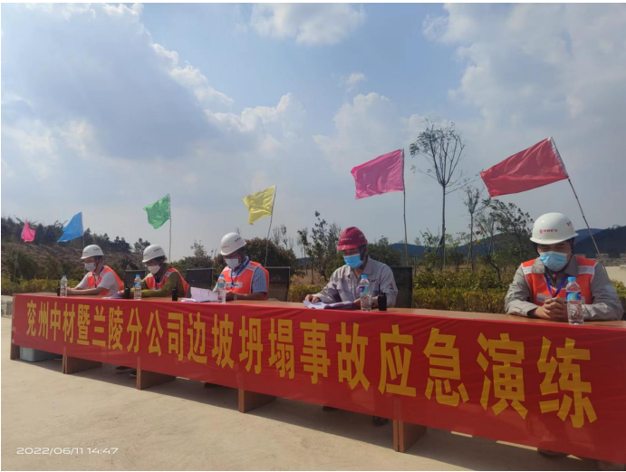 | 2022年6月11日,為增強員工安全防范意識和提高應急處置能力,強化員工應對災害事故的自救和搶險技能,加深對分公司應急預案的了解程度、提高應急救援流程的知悉度。兗州中材建設有限公司在臨沂中聯水泥有限公司水泥用石灰巖礦現場舉辦坍塌事故應急演練活動。