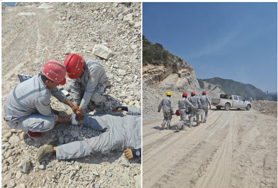 此次演練是模擬爆破后,爆破作業人員進入爆破作業區域確定是否有無盲炮,由于爆破震動產生巖體松動,爆破作業人員躲閃不及被落石砸傷,導致無法起身。事故發生后,分公司立即上報并啟動放炮事故應急預案,循序開展救援。