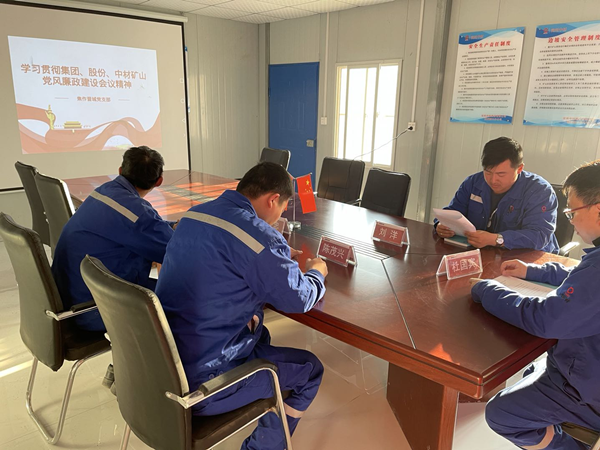 2021年4月9日,焦作晉城黨支部召開全體黨員大會,集中學習貫徹落實2021年中國建材集團、中國建材股份、中材礦山黨風廉政建設會議材料,會議由支部書記杜國賓支持,支部全體黨員參加